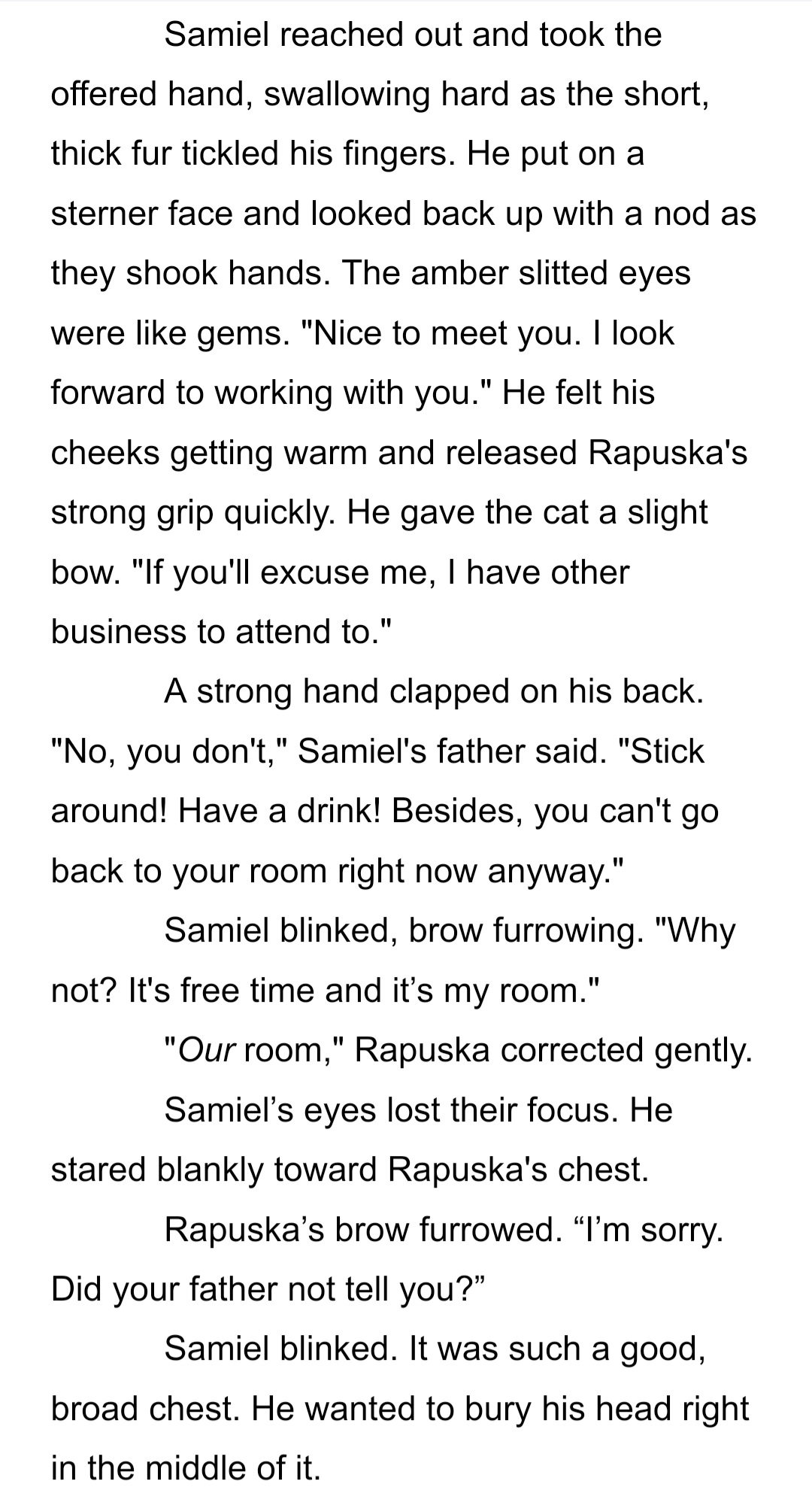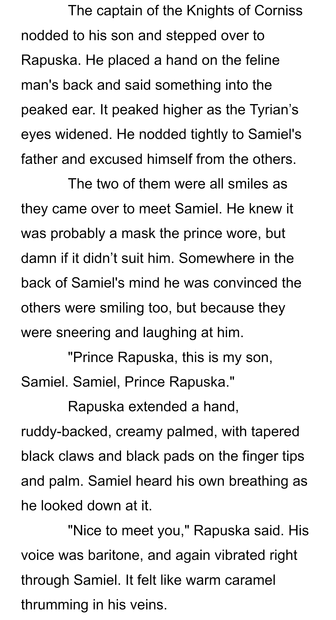 When Prince Rapuska of Tyria, a Felien, arrives at the guard corps as a diplomatic envoy to Corniss, his highest priority is getting the lay of the land. His most readily available source of information there is his new roommate: the enigmatic Samiel.